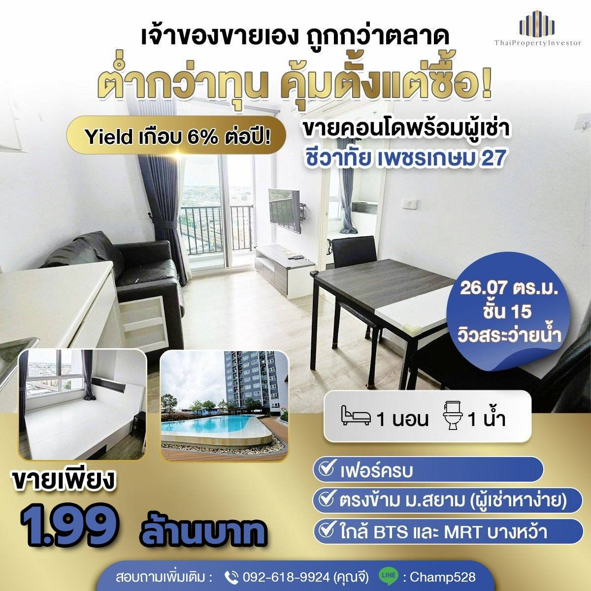 屋主自卖!从没有出租过!高楼层!游泳池边View Seacon Bang Khae,出售公寓 Chewathai Phetkasem 27,1房型,26平方米,紧邻主路,近MRT Bang Wa Phasi Charoen,出行方便,还有电视,冰箱!