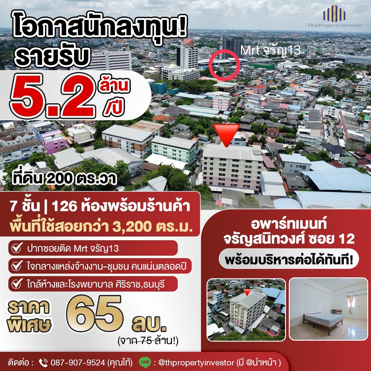 收益率8%!!出售Charansanitwong Soi 12的7层公寓楼。结构坚固,年利润高达520万泰铢。如果管理得当,利润甚至可能更高。面积200平方哇,7层,126个房间,可通往Charansanitwong Soi 13地铁站。该公寓位于社区和就业区的中心地带,实属难得!