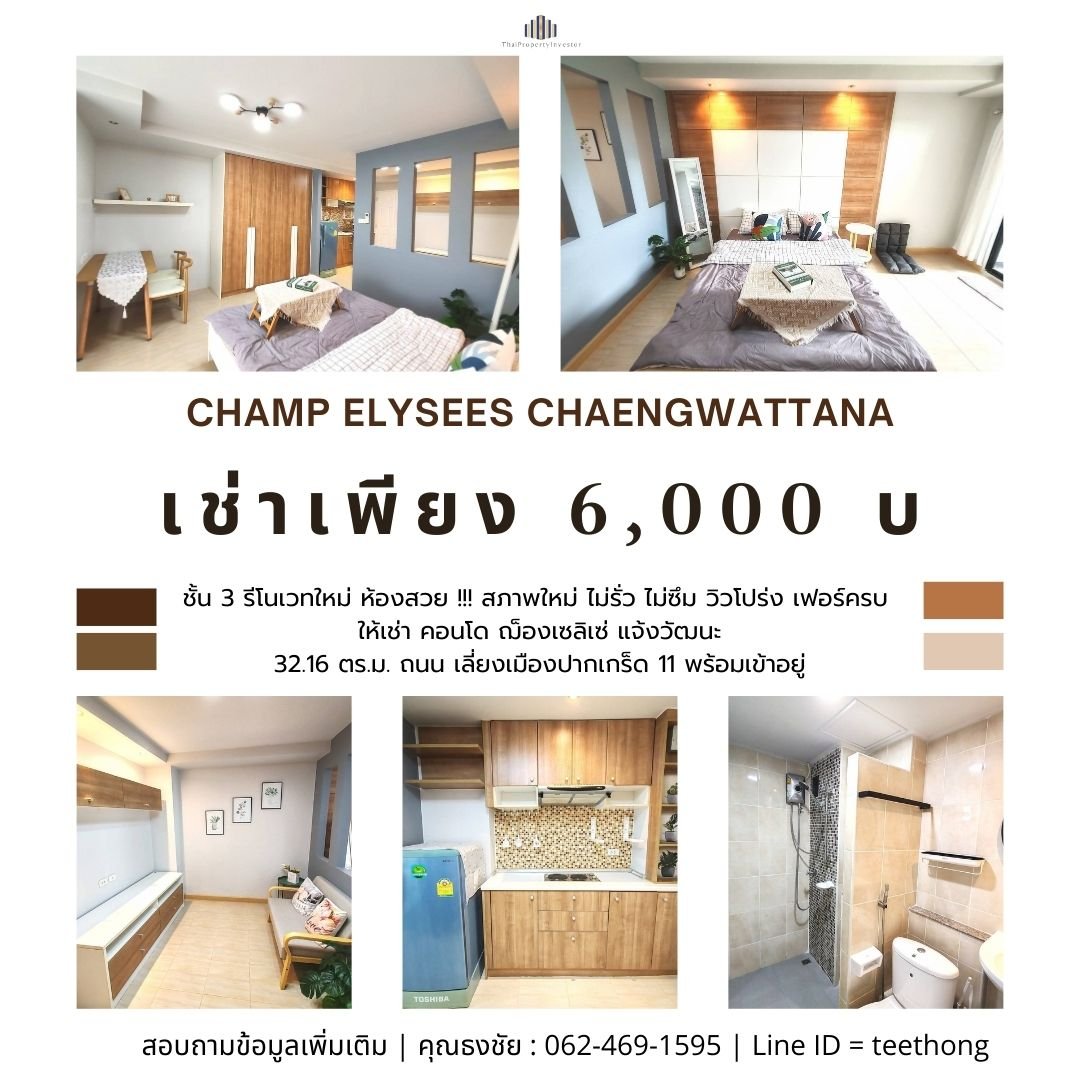 全新装修,出租精美房间!位于北革11区绕城公路 Champ Elysees  Chaengwattana 公寓,全新装修,无漏水,视野开阔,家具齐全,拎包入住。面积32.16平方米,B栋3楼