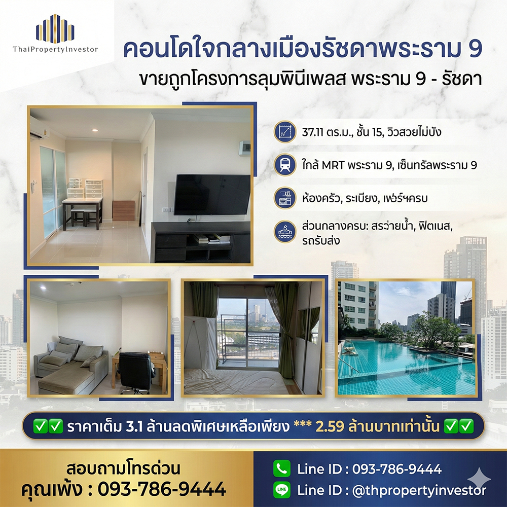 Prime City Condo for Sale – Rama 9 / Ratchada Lumpini Place Rama 9 – Ratchada Building B, 37.11 sq.m., 15th floor with open, unobstructed city views. Located just minutes from Central Rama 9 and MRT Rama 9.