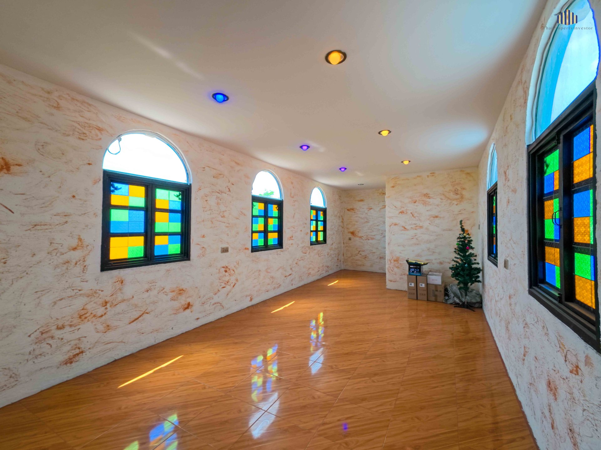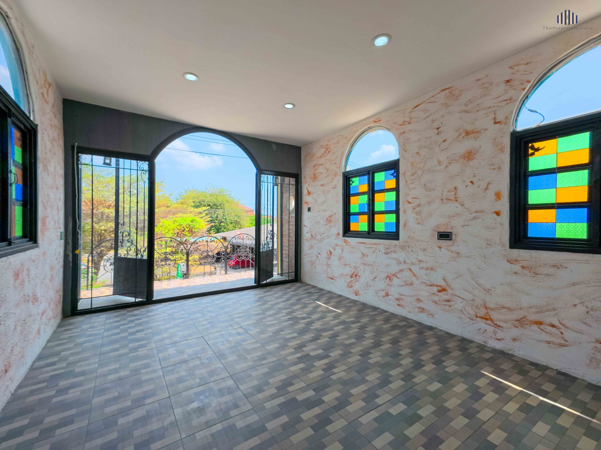 European-style design with stained glass and arched windows, distinctive character