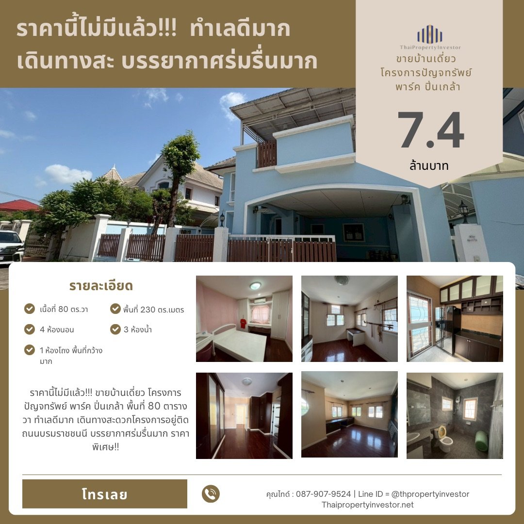 ขายด่วน! บ้านเดี่ยว ปัญจทรัพย์ พาร์ค ปิ่นเกล้า 80 ตร.ว. พื้นที่ใช้สอย 230 ตร.ม. ทำเลดีติดถนนบรมราชชนนี บรรยากาศร่มรื่น ใกล้เซ็นทรัลปิ่นเกล้าและ รพ.ธนบุรี 2 ราคาพิเศษ 7.4 ล้านบาท