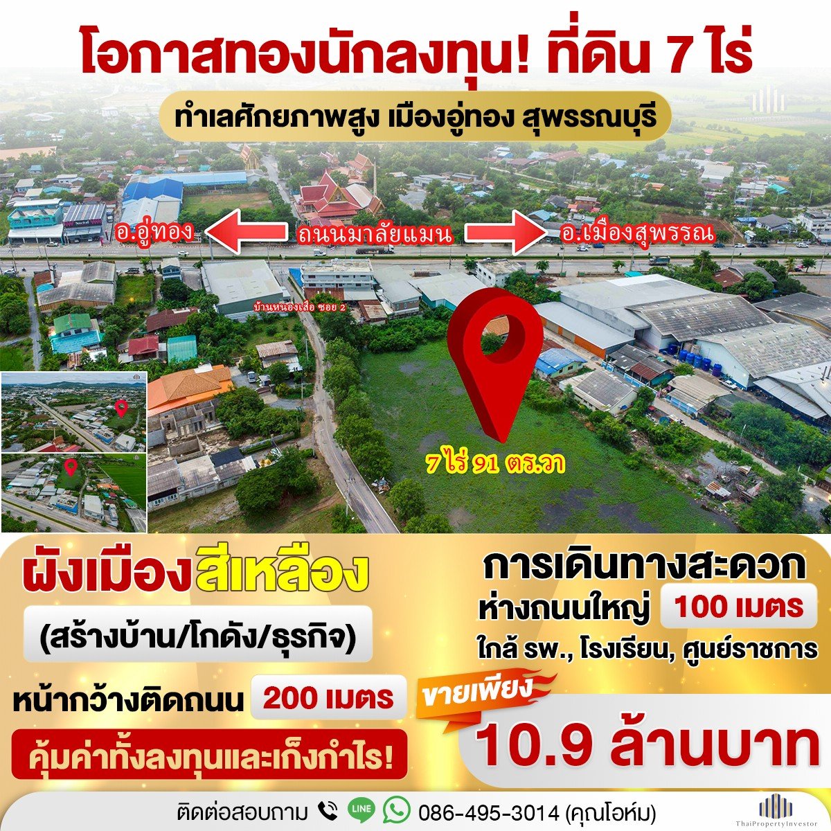 ขายด่วน! ที่ดิน 7-0-91 ไร่ อ.อู่ทอง สุพรรณบุรี ผังเมืองสีเหลือง หน้ากว้าง 200 ม. เข้าซอยเพียง 100 ม. เหมาะทำโครงการจัดสรรหรือโกดัง ใกล้หอนาฬิกาบรรหาร