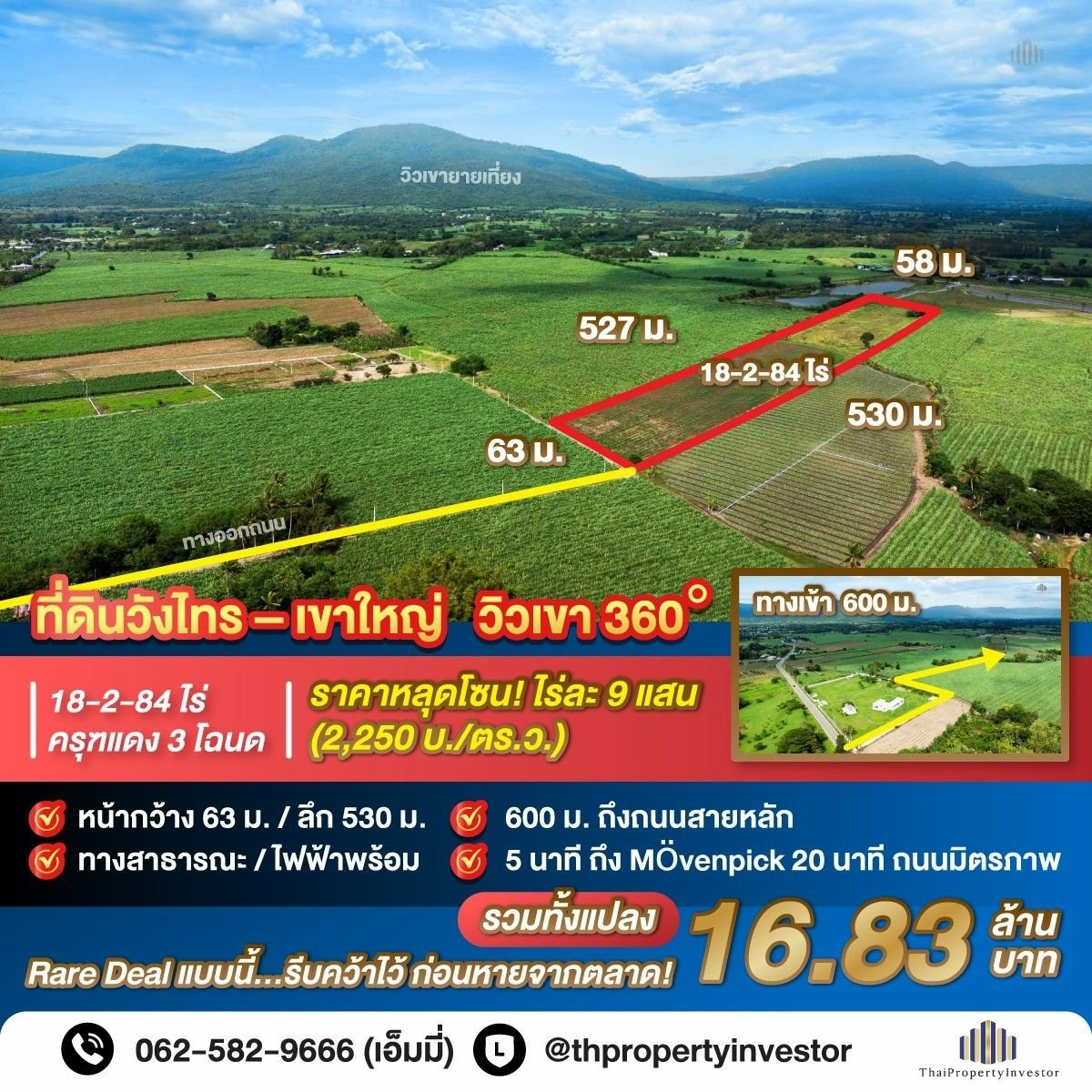 ครุฑแดง 3 โฉนด เพียงไร่ละ 900,000 บาท เข้ามาเพียงนิดเดียวจากถนนหลัก แต่ราคาถูกกว่าติดถนนเกือบครึ่ง พร้อมวิวภูเขา–ธรรมชาติ 360° ไม่มีสิ่งบดบัง เพียง 10 นาทีถึงสนามกอล์ฟ My Ozone & Mövenpick Khao Yai