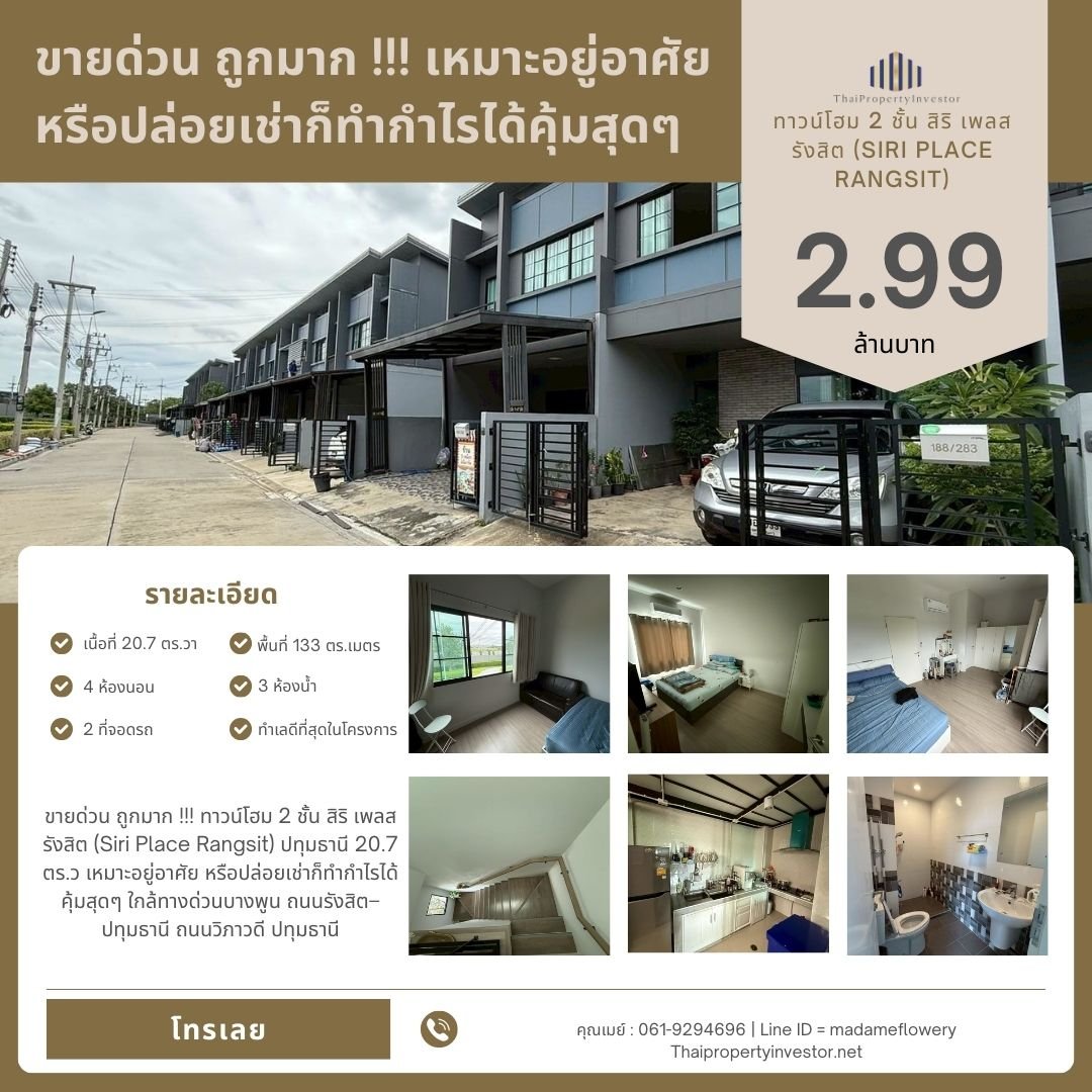 ขายด่วน ถูกมาก !!! ทาวน์โฮม 2 ชั้น สิริ เพลส รังสิต (Siri Place Rangsit) ปทุมธานี 20.7 ตร.ว เหมาะอยู่อาศัย หรือปล่อยเช่าก็ทำกำไรได้คุ้มสุดๆ ใกล้ทางด่วนบางพูน ถนนรังสิต–ปทุมธานี ถนนวิภาวดี ปทุมธานี