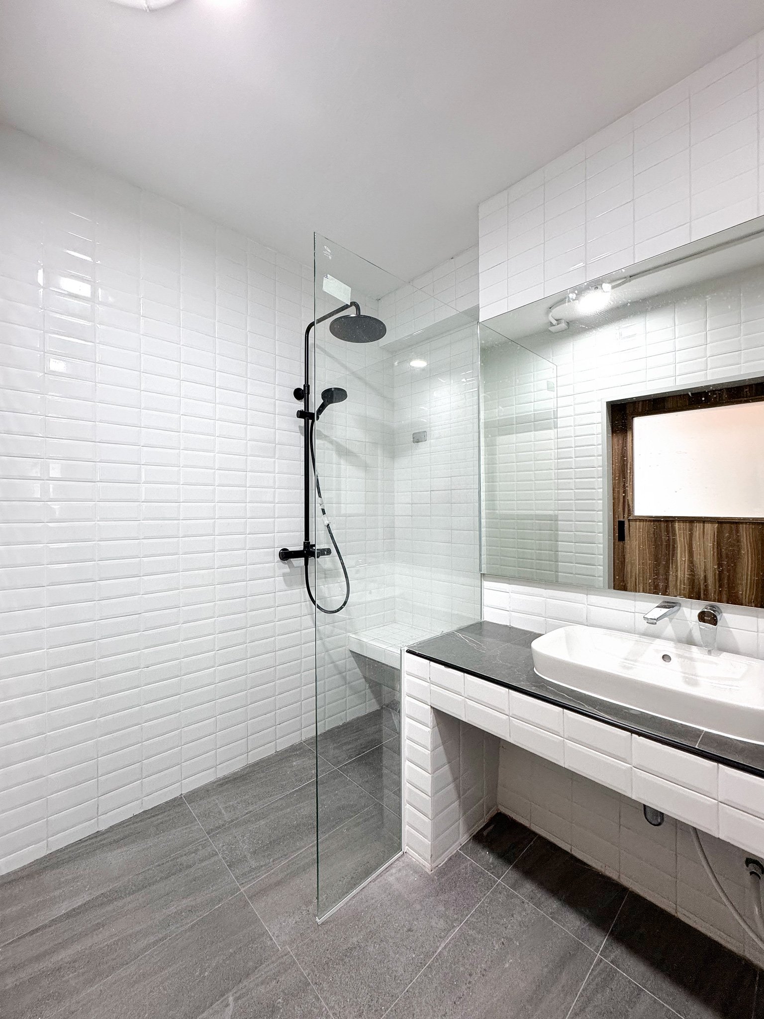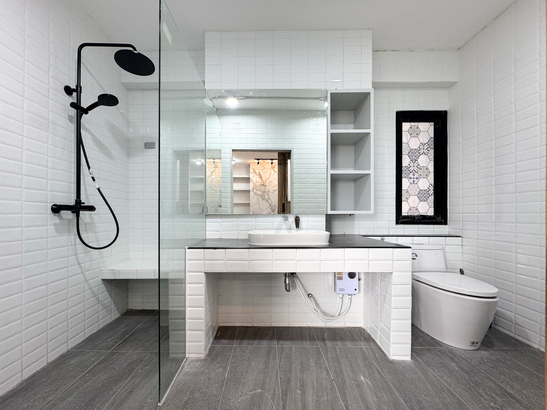 ห้องน้ำดีไซน์พิเศษ โทน ขาว–ดำสุดมินิมอล ตามภาพจริง ดูสะอาดตาและทันสมัย