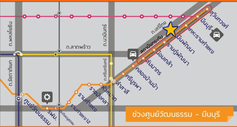 ใกล้สถานี Interchange สายสีชมพู สถานีมีนบุรี (ถัดไป 2 สถานี) และสายสีเหลือง Interchange สถานีลำสาลี