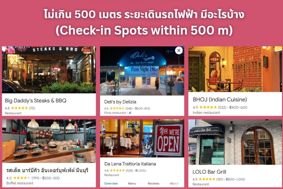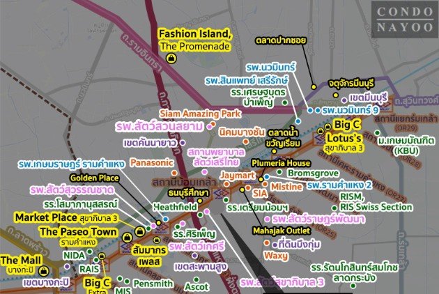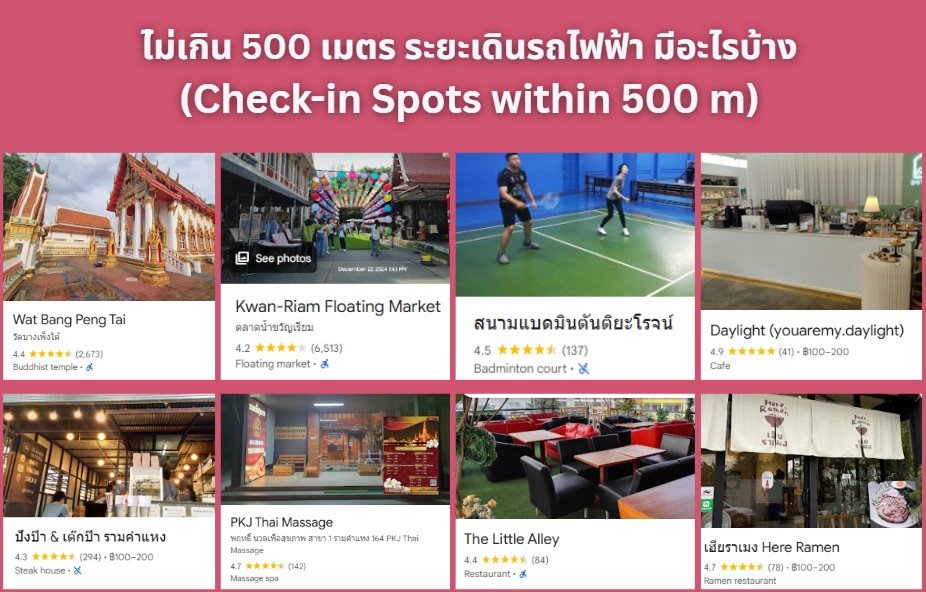 เสรีไทย 600 เมตร / ร่มเกล้า 3.6 กม. / สุวินทวงศ์ 4.6 กม. / รามอินทรา 5.6 กม. / ลาดพร้าว 8.6 กม.
