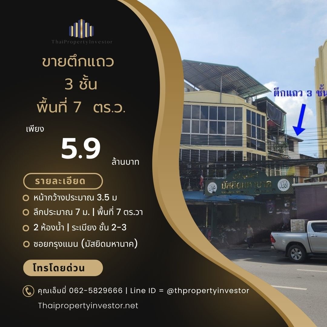 ขายอาคารพาณิชย์ 3 ชั้น โบ๊เบ๊ ซอยกรุงแมน ตรงข้ามสะพาน 4 ห่างถนนใหญ่ 10 ม. เหมาะทำโกดังเก็บของหรือปล่อยเช่า ผลตอบแทนดี ใจกลางย่านค้าส่ง