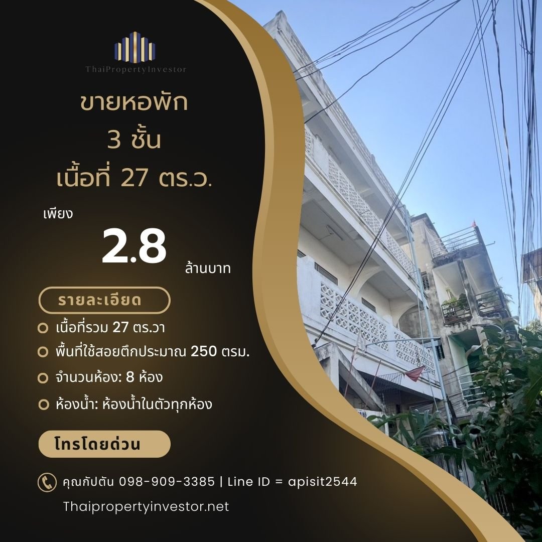 ขายหอพัก 3 ชั้น 8 ห้อง ห้องน้ำในตัวทุกห้อง บนที่ดิน 27 ตร.ว. พื้นที่ใช้สอยประมาณ 250 ตร.ม. เหมาะสำหรับนักลงทุนที่อยากเริ่มต้นลงทุนอสังหาฯ เพื่อทำรายได้ต่อเนื่อง บริหารดี ๆ มีโอกาสทำผลตอบแทนได้ถึง 10% ต่อปี ทำเลดี ใกล้ MRT ไฟฉาย หาผู้เช่าง่าย