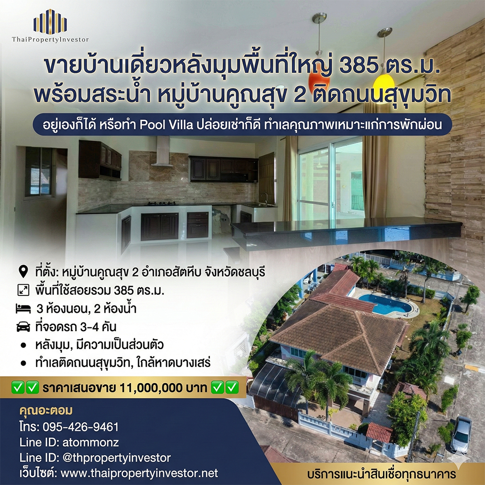 บ้านหลังมุมพร้อมสระน้ำในทำเลที่มีดีมานด์สูงแบบนี้ ถือเป็นทรัพย์ที่ตอบโจทย์ทั้งการอยู่อาศัยและการลงทุนอย่างแท้จริง เหมาะสำหรับผู้ที่ต้องการบ้านบรรยากาศพักผ่อน และผู้ที่ต้องการสร้างรายได้จากการทำ Pool Villa ในโซนยอดนิยมของสัตหีบ
