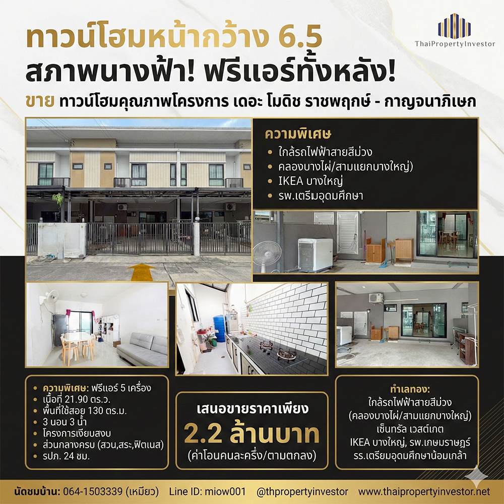 ขายด่วน (สภาพนางฟ้า) ทาวน์โฮม The Modish Ratchaphruek-Kanchanapisek หน้ากว้างพิเศษ 6.5 เมตร เนื้อที่ 21.9 ตร.ว. 3 นอน 3 น้ำ แถมแอร์ทั้งหลัง 5 เครื่อง ใกล้ Central Westgate และรถไฟฟ้าสายสีม่วง ราคา 2.2 ล้านบาท