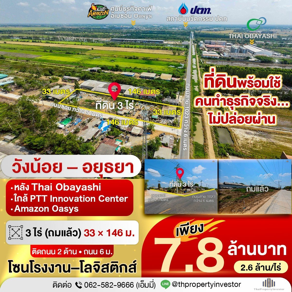 ที่ดิน 3 ไร่ โซนอุตสาหกรรมวังน้อย “อยู่หลัง Obayashi และใกล้สถาบันนวัตกรรม ปตท.” จุดเด่นคือถมแล้ว ใช้งานได้ทันที พร้อมหน้าที่ดินติดถนน 2 ด้าน รองรับการเข้า–ออกได้สะดวก เหมาะสำหรับโกดัง ลานสินค้า หรือโลจิสติกส์ ที่ต้องการเริ่มก่อน ได้เปรียบก่อน ในทำเลโรงงานจริง